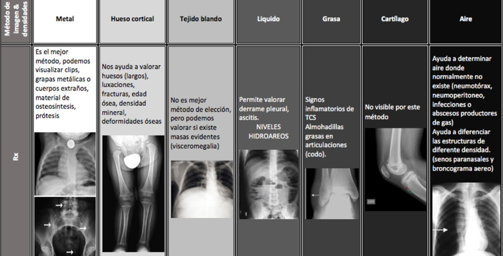 Dependiendo de la sustancia y del estado físico de la materia, los rayos X tienen la propiedad de atravesar el cuerpo humano, con diferentes absorciones que se detallan mediante los distintos tipos de densidades.